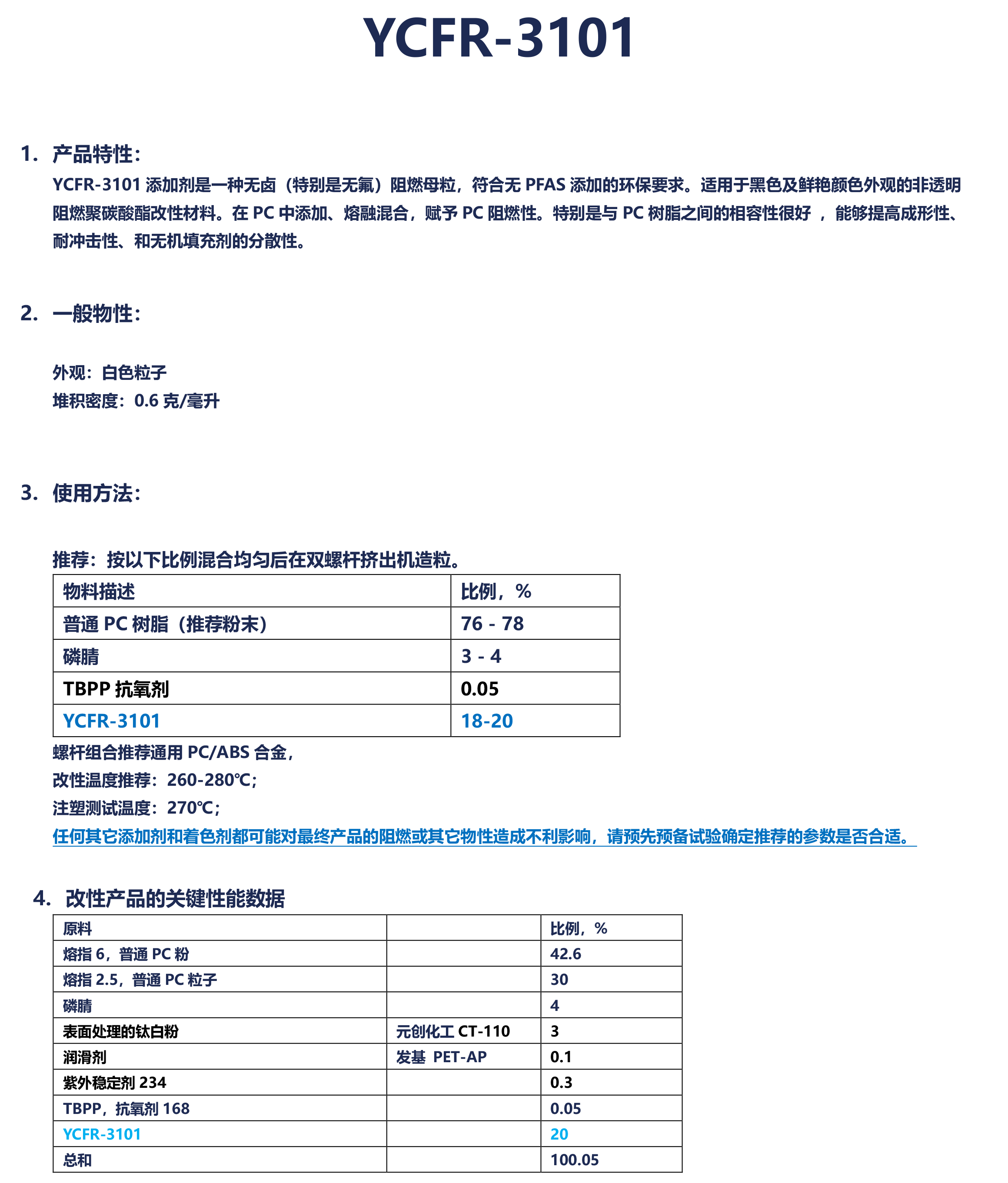 YCFR-3101 添加剂是一种无卤(特别是无氟)阻燃母粒,适用于非透明的环保阻燃聚碳酸酯改性材料。在 PC 中添加、熔融混合,赋予 PC 阻燃性。特别是与 PC 树脂之间的相容性很好 ,能够提高成形性、耐冲击性、和无机填充剂的分散性。