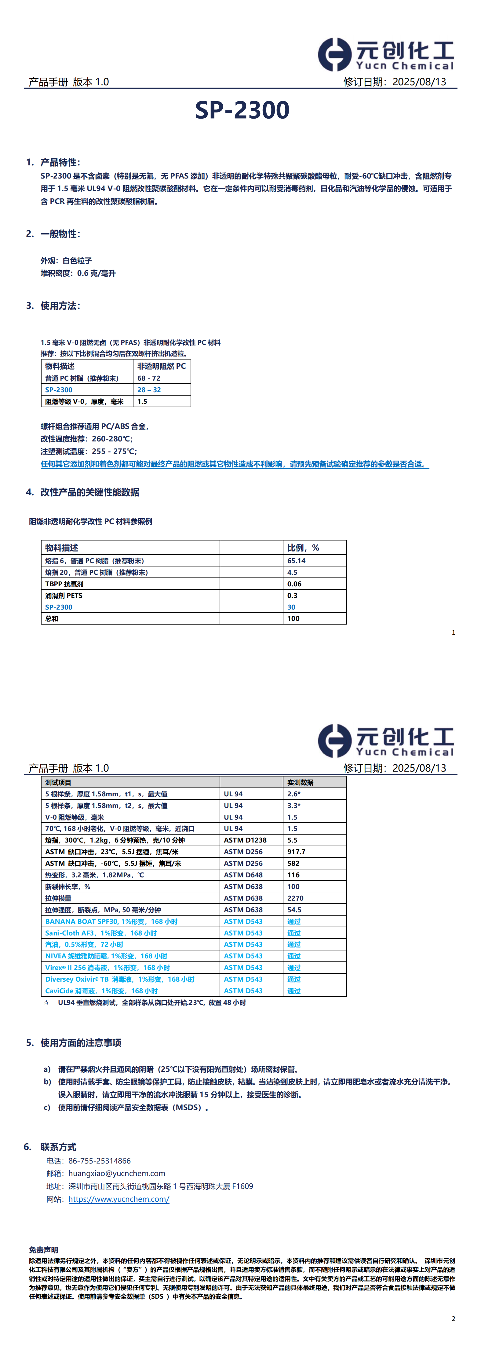 SP-2300 是不含卤素(特别是无氟,无 PFAS 添加)非透明的耐化学特殊共聚聚碳酸酯母粒,耐受-60℃缺口冲击,含阻燃剂专