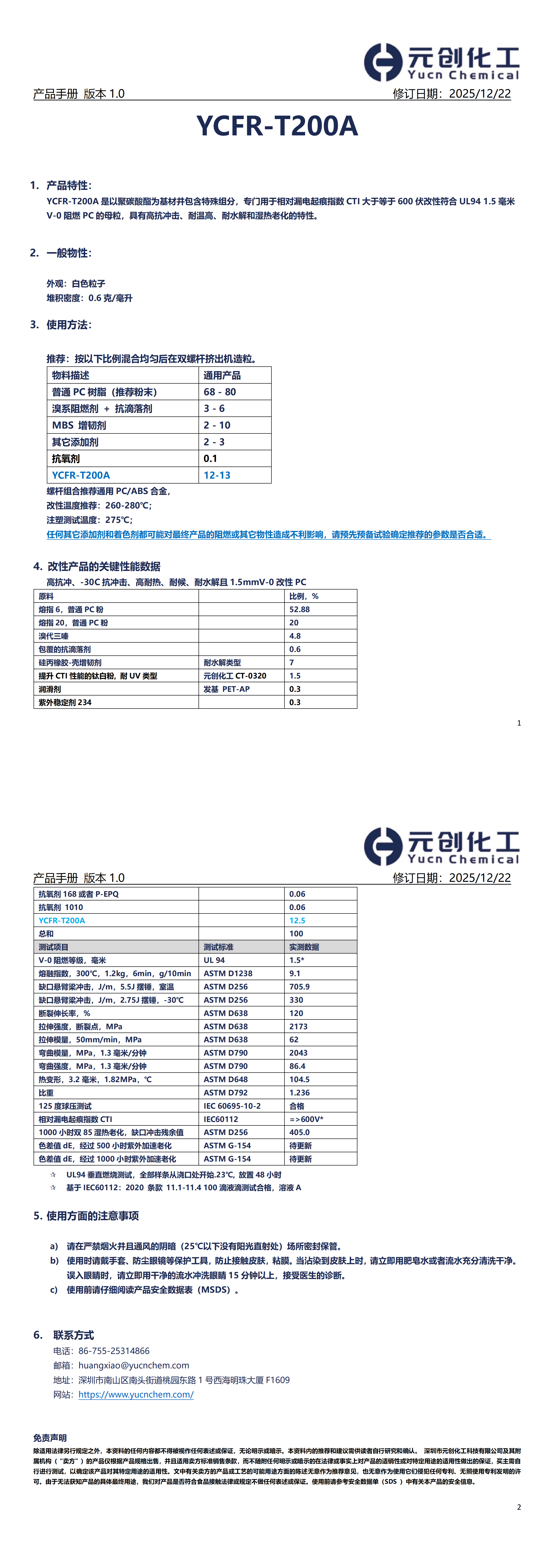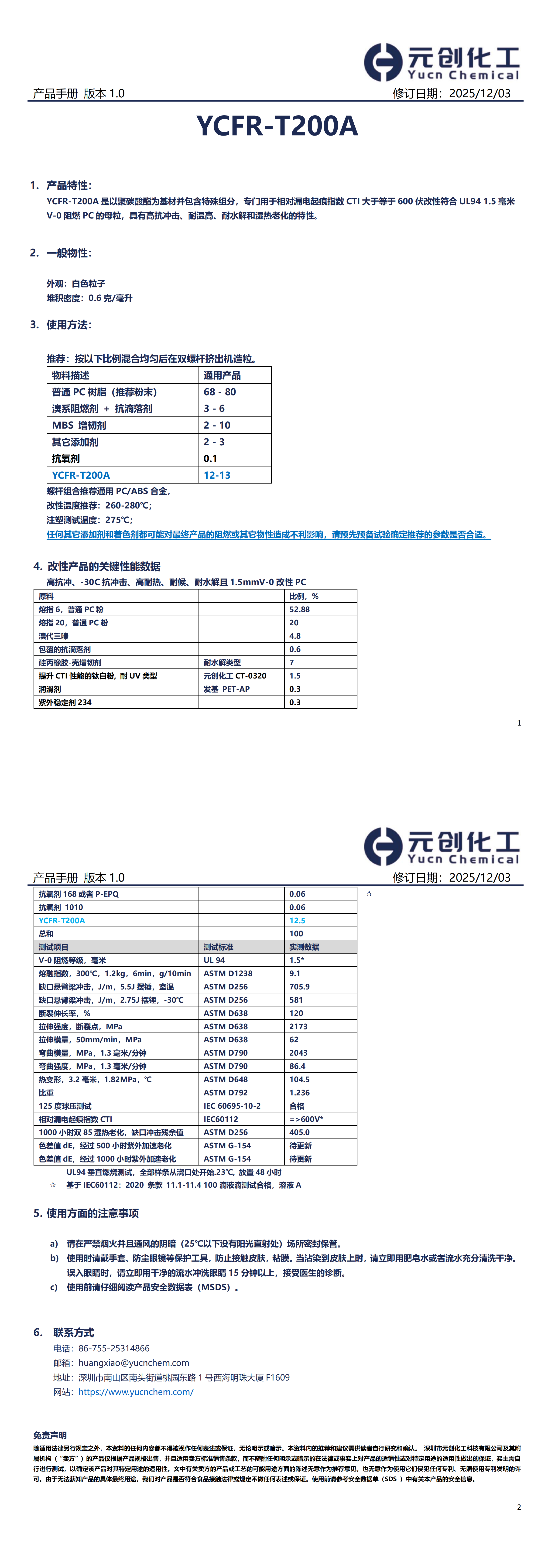 YCFR-T200A 是以聚碳酸酯为基材并包含特殊组分,专门用于相对漏电起痕指数 CTI 大于等于 600 伏改性符合 UL94 1.5 毫米