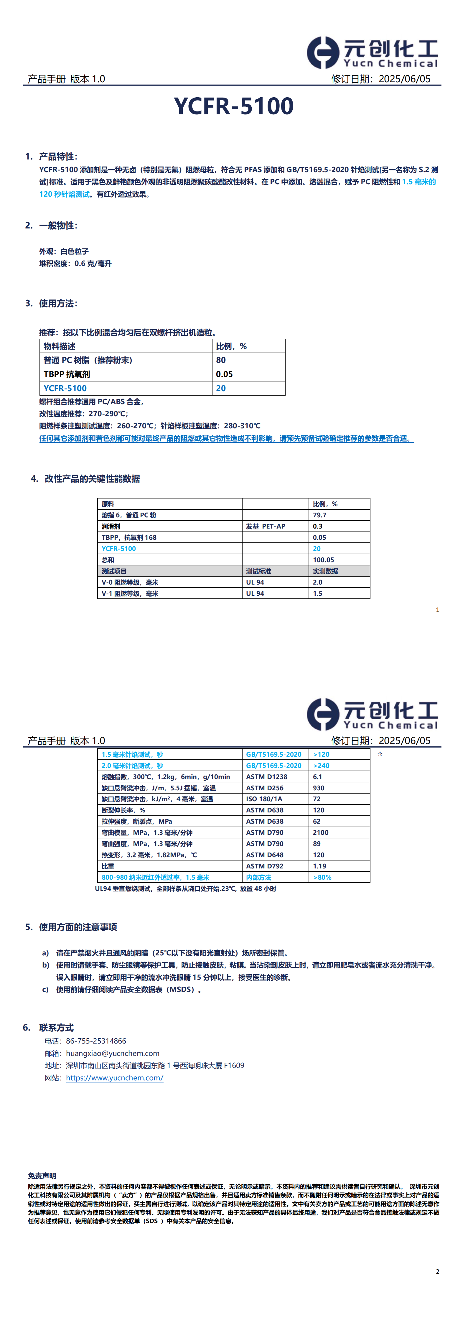 YCFR-5100 添加剂是一种无卤(特别是无氟)阻燃母粒,符合无 PFAS 添加和 GB/T5169.5-2020 针焰测试[另一名称为 S.2 测