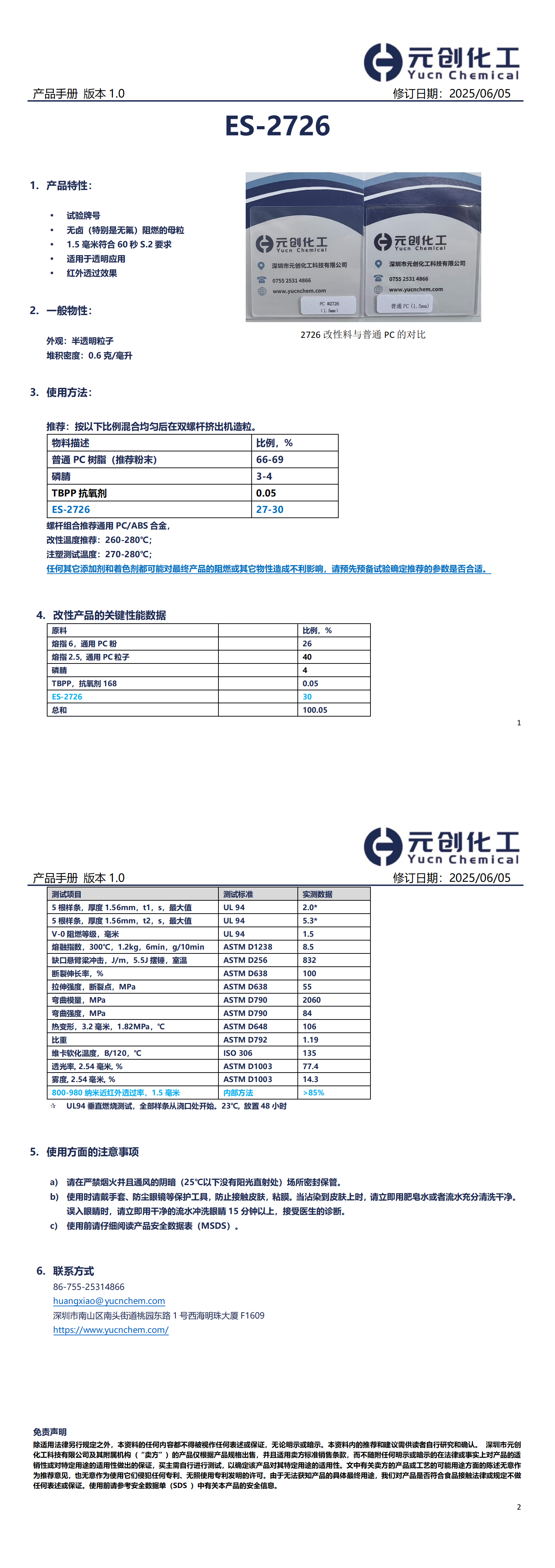 SP-2300 是不含卤素(特别是无氟,无 PFAS 添加)非透明的耐化学特殊共聚聚碳酸酯母粒,耐受-60℃缺口冲击,含阻燃剂专 用于 1.5 毫米 UL94 V-0 阻燃改性聚碳酸酯材料。